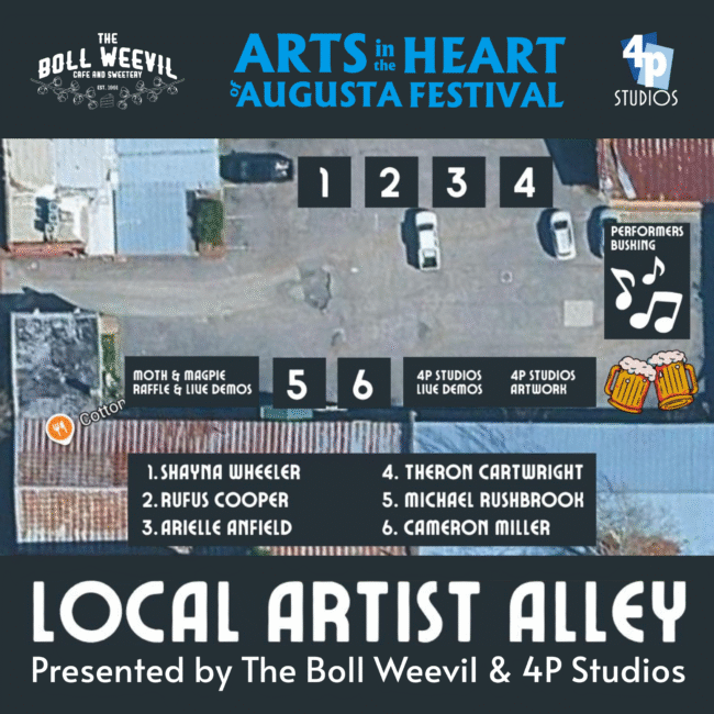This year, the Artzillards are on 8th Street. Join us in celebrating 10 local artists live creating during Augusta’s biggest Arts and Culture Celebration of the Year. Find Jo